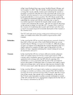 The senior preferred shares will qualify as Tier 1 capital and will rank senior to common stock and pari passu, which is at an equal level in the capital structure, with existing preferred shares, other than preferred shares which by their terms rank junior to any other existing preferred shares. The senior preferred shares will pay a cumulative dividend rate of 5 percent per annum for the first five years and will reset to a rate of 9 percent per annum after year five. The senior preferred shares will be non-voting, other than class voting rights on matters that could adversely affect the shares. The senior preferred shares will be callable at par after three years. Prior to the end of three years, the senior preferred may be redeemed with the proceeds from a qualifying equity offering of any Tier 1 perpetual preferred or common stock. Treasury may also transfer the senior preferred shares to a third party at any time. In conjunction with the purchase of senior preferred shares, Treasury will receive warrants to purchase common stock with an aggregate market price equal to 15 percent of the senior preferred investment. The exercise price on the warrants will be the market price of the participating institution’s common stock at the time of issuance, calculated on a 20-trading day trailing average.
