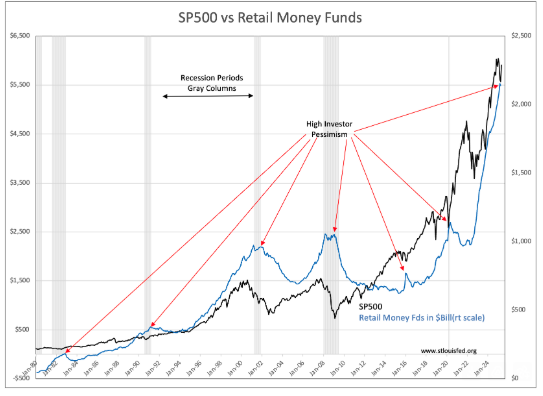 Retail Money Funds have always peaked at SP500 lows. Retail Money Funds series is a market psychology indicator. Feb’s 2025, with recent adjustments, is reported as a peak at $2088.3Bil vs 2 month decline to April’s $20140.3Bil. It is fascinating in that consumer confidence has recently improved. I observe that many industrials are recovering from April lows. This could be coincidental or it could be a sign that the current administration’s tariff policies have spurred retail equity investment.