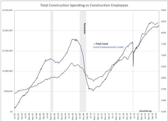 When construction activity is in the “green-field” stage, construction spending is less than is spent during the actual construction. The “green-field” work is land clearing and installation of culverts and other underground services. The employee count rises but not as rapidly as main construction costs which come later and includes the building materials like concrete and steel. The rise in construction employment leads the rise in construction spending by about 6mos.