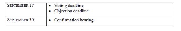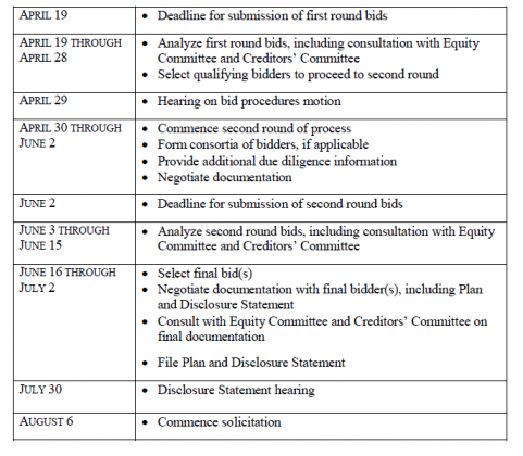 minimum investment of $100 million.Each Term Sheet must contain detailed descriptions of the M&A Transaction, Asset Purchase, Plan Sponsor Investment and Plan (collectively, as applicable, the “Transaction”) that are the subject of such Term Sheet. Subject to the applicable confidentiality agreements or provisions, the Company and its professionals will share the Term Sheets received during the first round with the advisors to the official committee of equity security holders and the official committee of unsecured creditors (collectively, the “Committees”).