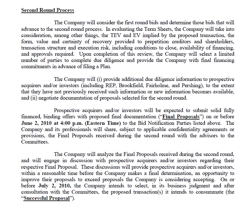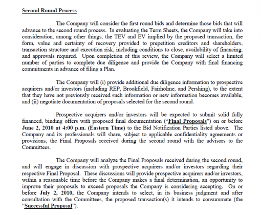 The Company will review those Term Sheets timely submitted and engage in negotiations with those prospective acquirer and/or investors that submitted Term Sheets complying with the preceding paragraph and as it deems appropriate in the exercise of its business judgment, subject to consultation with the Committees. The Company will select, in its business judgment and after consultation with the Committees, those proposals qualifying for the second round on or before April 28, 2010.