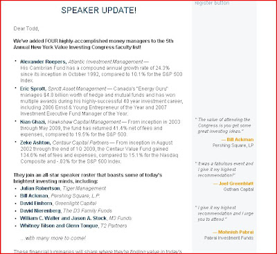 Jay over at Market Folly has a special discount to the Value Investing Congress this October in NYC. To me, it is the best value event out there today.